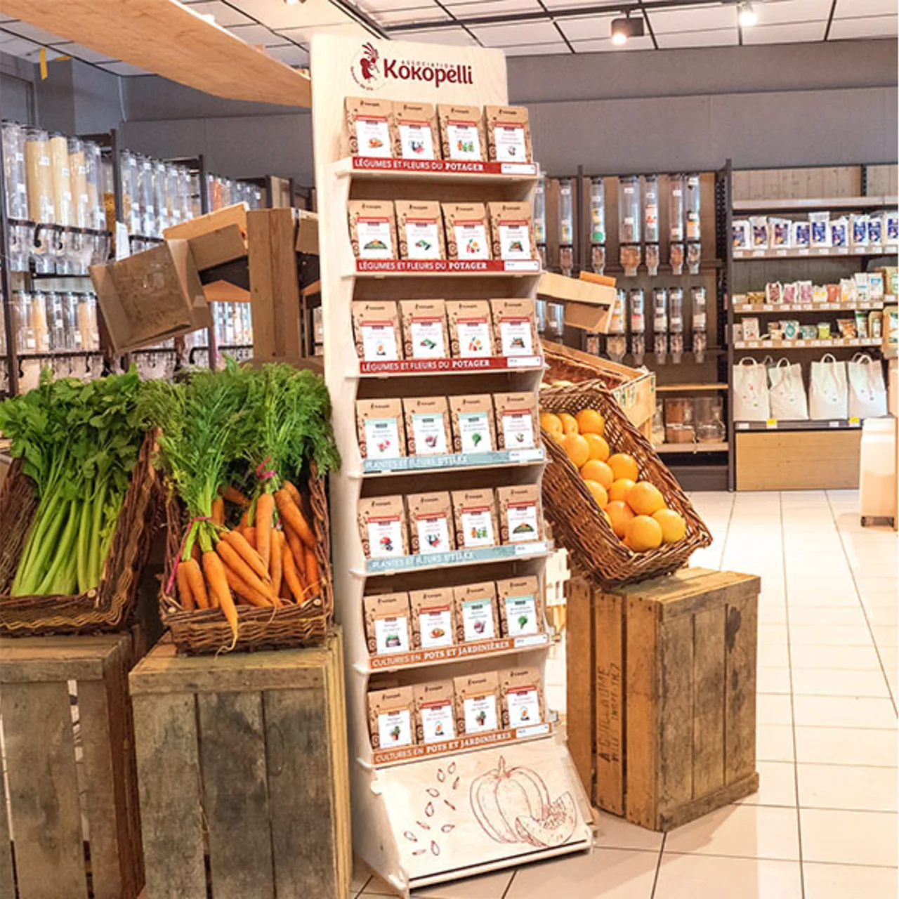 The wooden wall display, and its 40 varieties offer a solution suitable for most of the stores and an easy restocking throughout the seasons. This display, permanently installed in your store, will be a real landmark, throughout the seasons, for your gardening customers!
