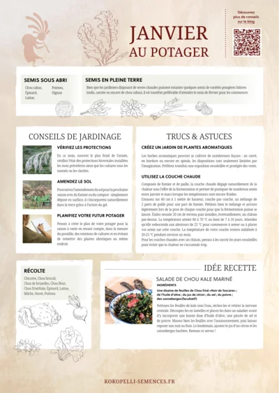 Pour des conseils détaillés sur les semis et l'entretien du potager en janvier, consultez notre article : Que faire en janvier au potager ? Le guide à télécharger est en cours de création, il sera bientôt mis en ligne.